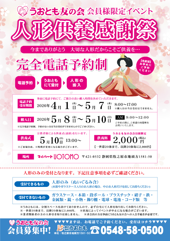 創業1969年。 魚屋としてはじまり、地域の皆さまに育てられながら、仕出し、宴会場、結婚式、お葬式、介護福祉と人生の節目を大切にしてきました。 私たち「うおともグループ」は、「旬の”感動”を、プロデュース」を企業理念とし、これからも人を想う「こころ」を大切に、私たちを育ててくれている地域の方の人生の節目が、感動のひとときとなるように精一杯お手伝いさせていただきます。